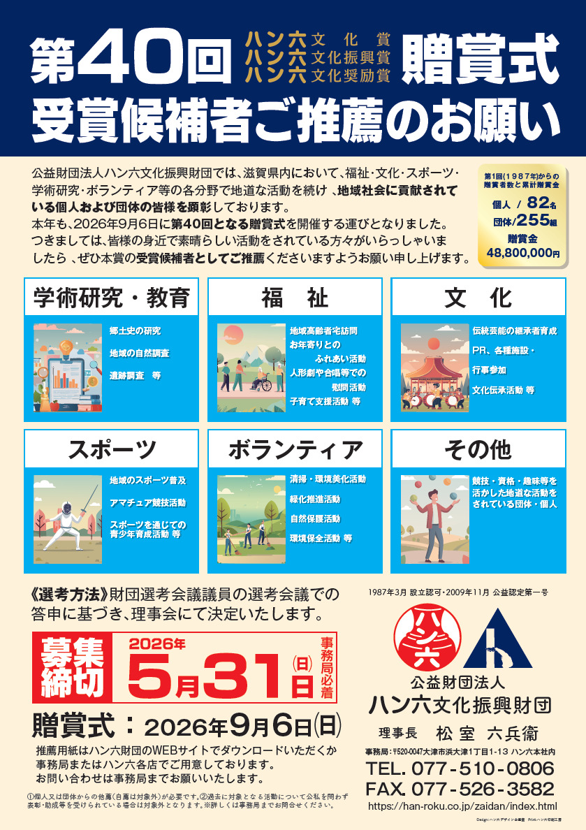 ハン六文化振興財団は、昭和62年(1987年)3月、四代目・六兵衞の発意により、郷土への感謝の想いをかたちにすべく、地域文化へのささやかな支援を目的として設立、その後、平成21年(2009年)11月には、公益法人制度改革に伴い、「公益財団法人」として滋賀県で第一号の認定をいただく運びとなりました。