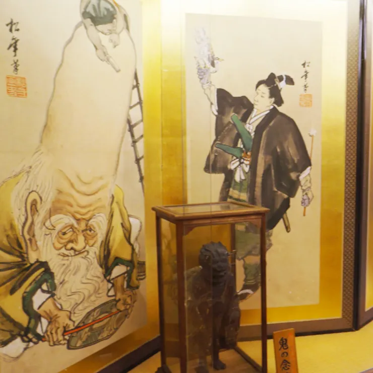 目の不自由な三味線弾きなど、座頭の姿を描いた画題。道徳的な教訓や、見かけで人を判断しないことへの戒めといった意味合いを込めて飾られました。 - 鬼の念仏
