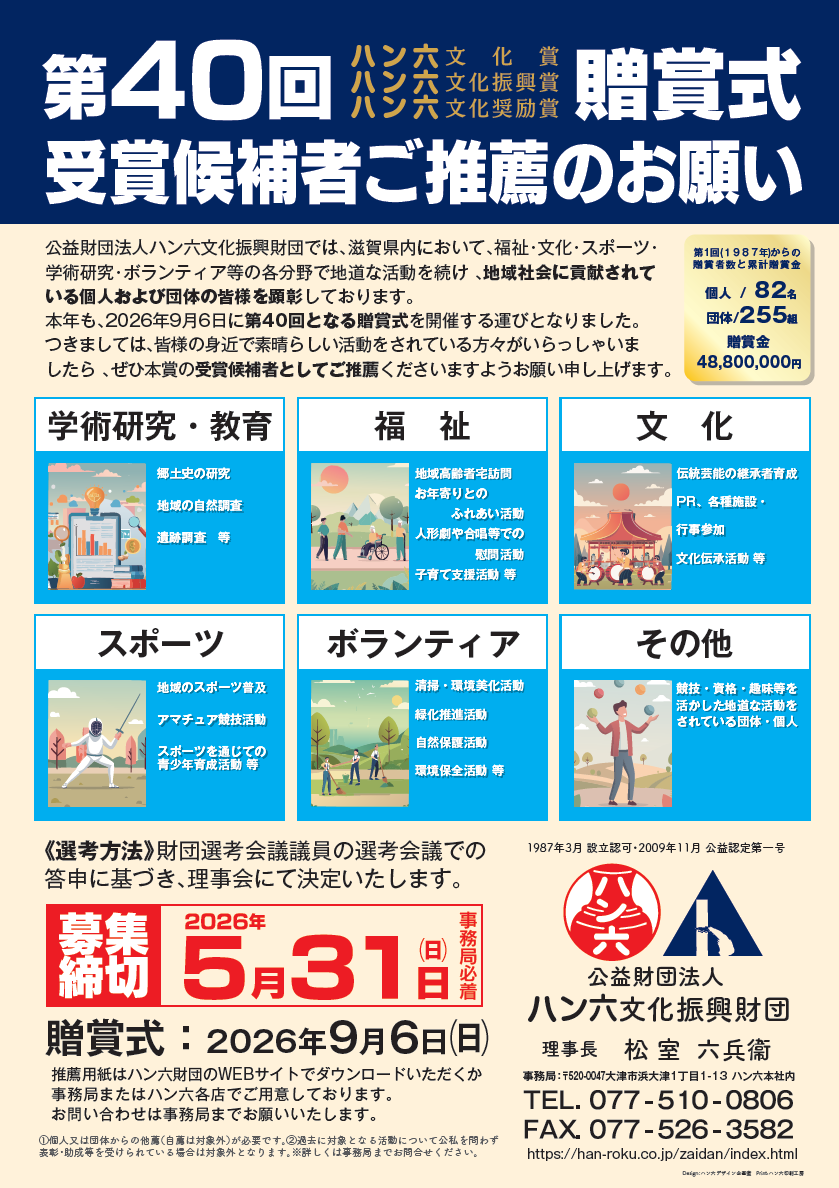 公益財団法人ハン六文化振興財団では、滋賀県内において、福祉・文化・スポーツ・学術研究・ボランティア等の各分野で地道な活動を続け、地域社会に貢献されている個人および団体の皆様を顕彰しております。